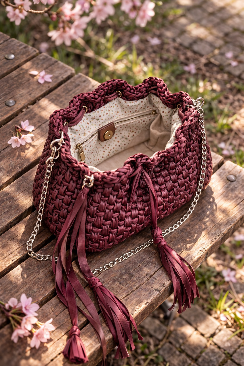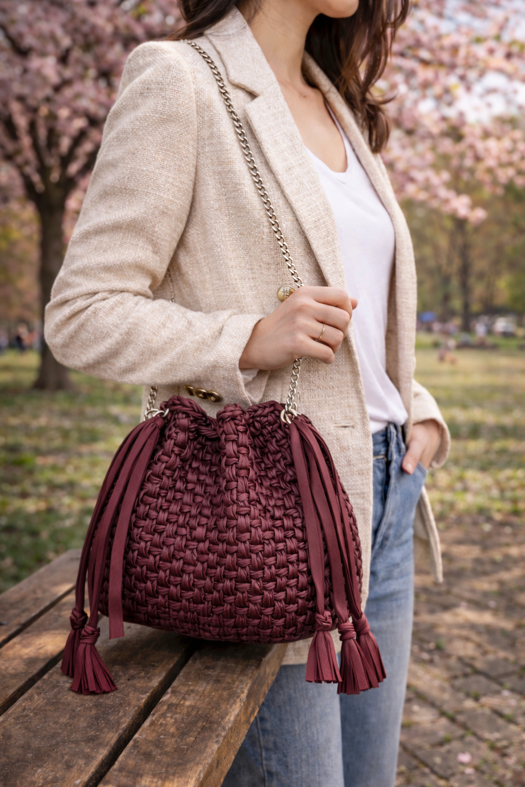 Borsa crochet artigianale dal colore burgundy intenso, caratterizzata da una trama intrecciata ricca e sofisticata.