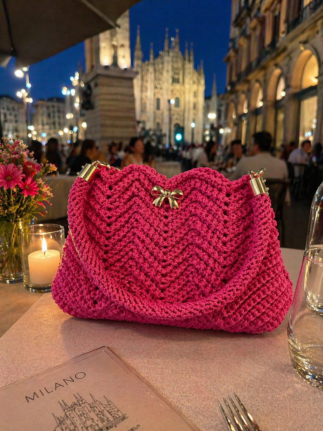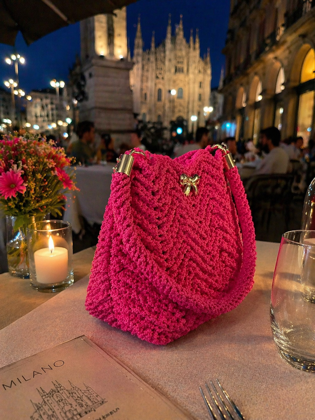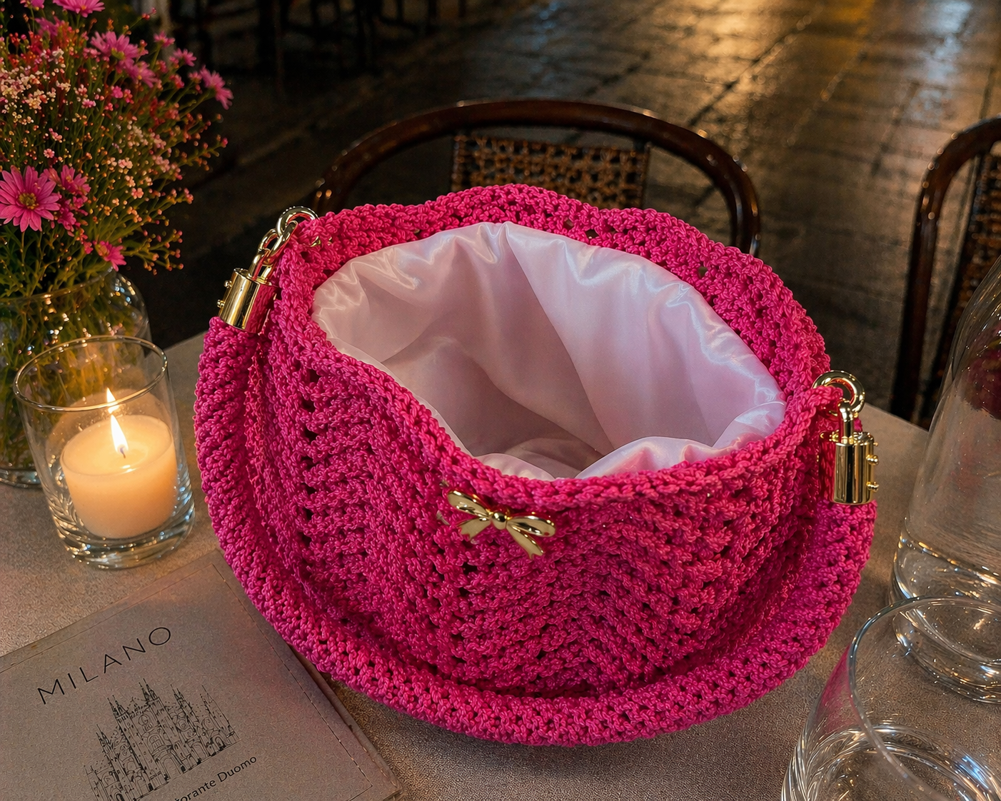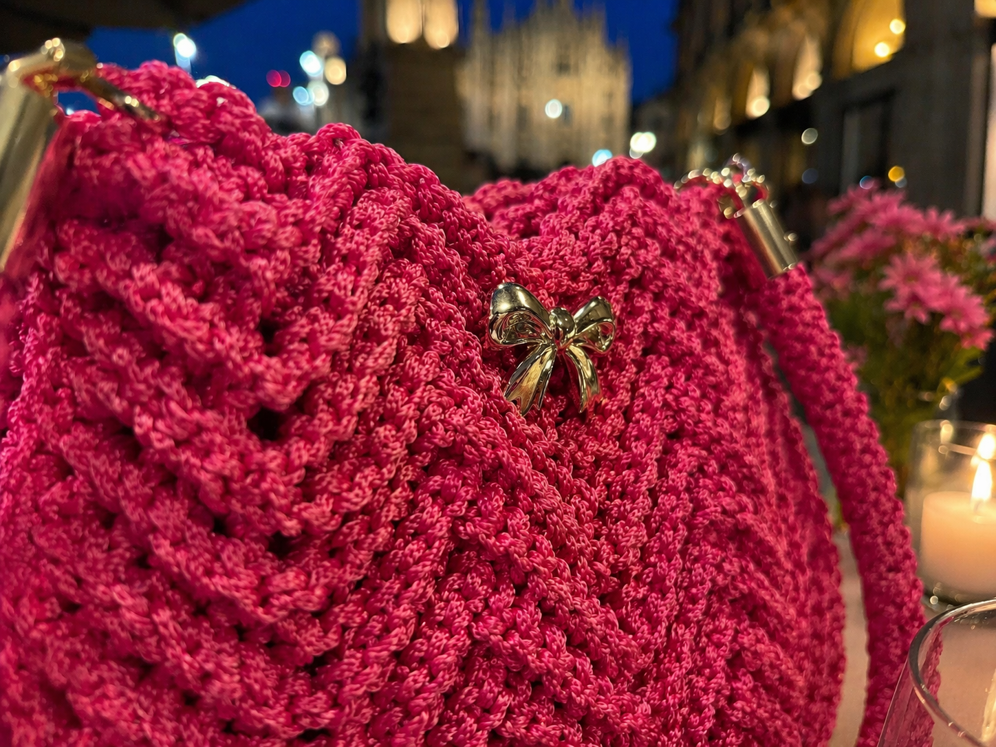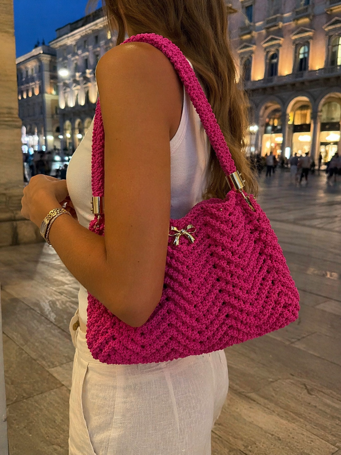Elegante, distintiva e contemporanea, questa borsa in crochet si distingue per il suo design artigianale e la forte identità cromatica. Realizzata con filato di alta qualità , presenta una lavorazione tridimensionale a motivo chevron che dona struttura e carattere, valorizzata da raffinati dettagli metallici dorati e da un delicato fiocco frontale.