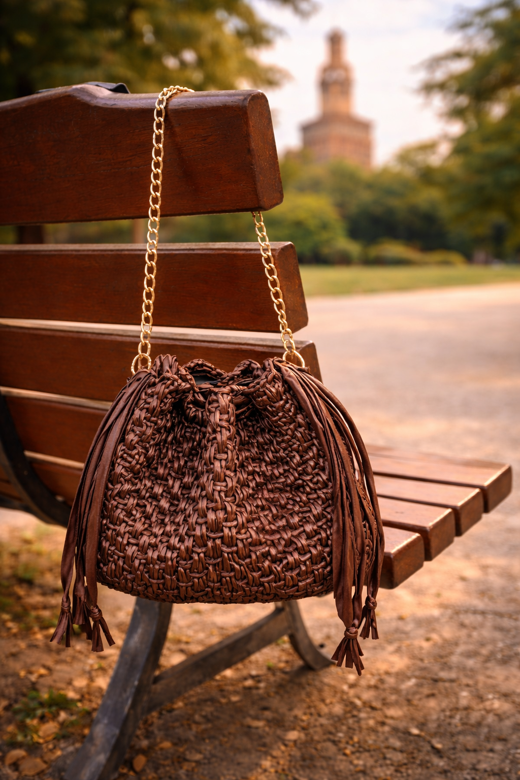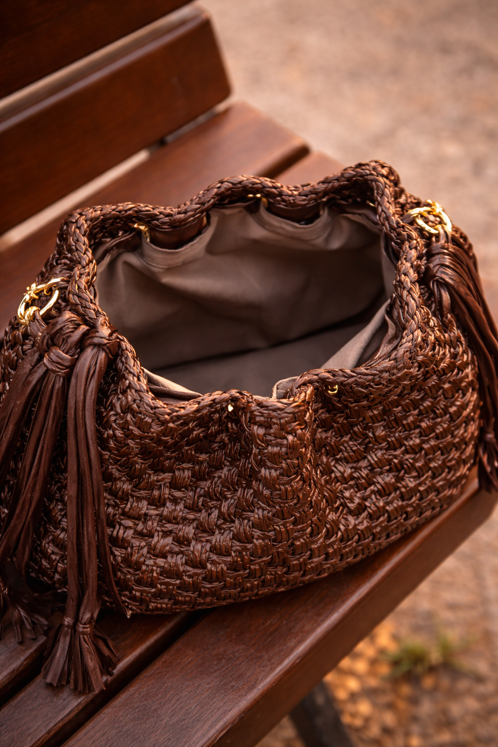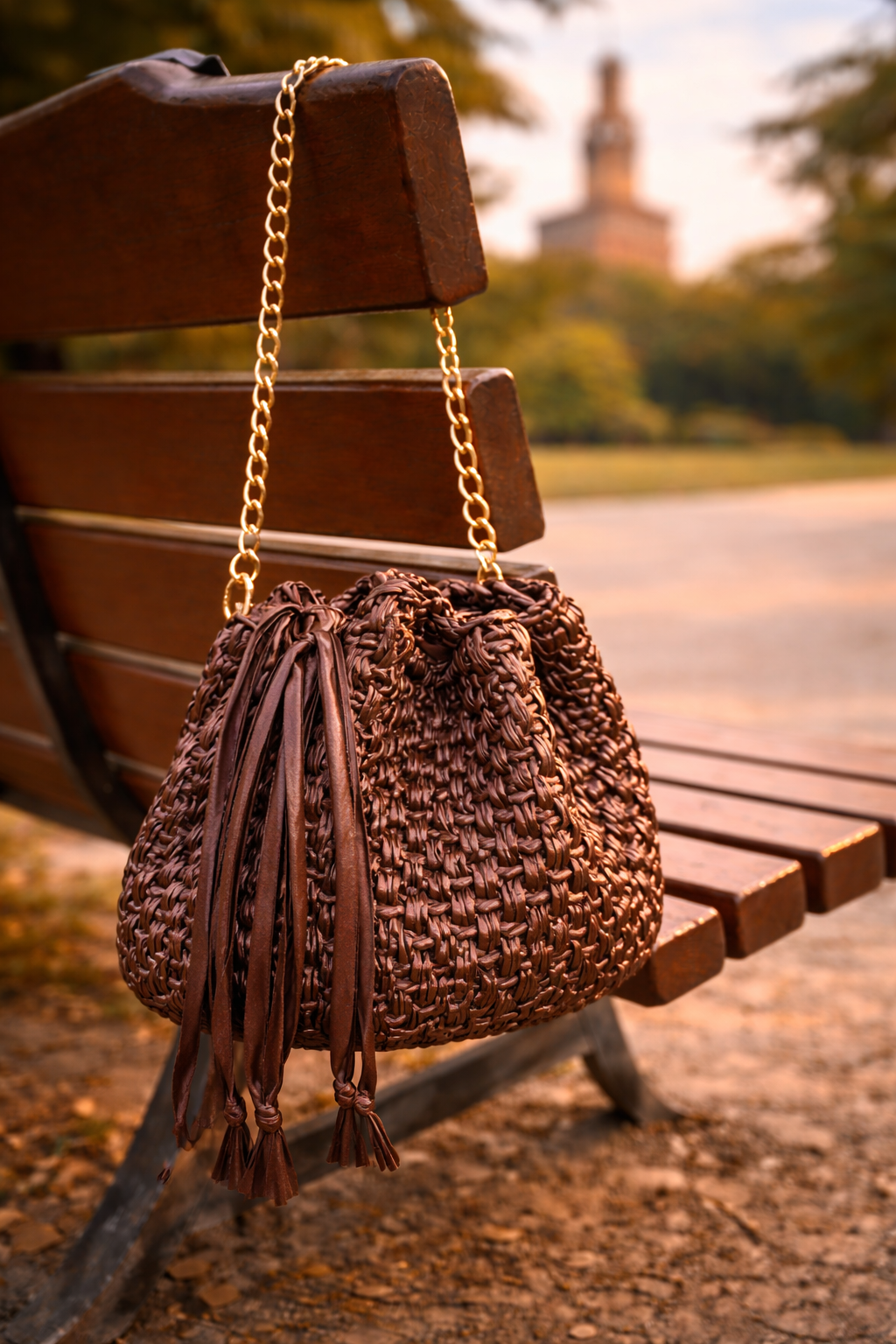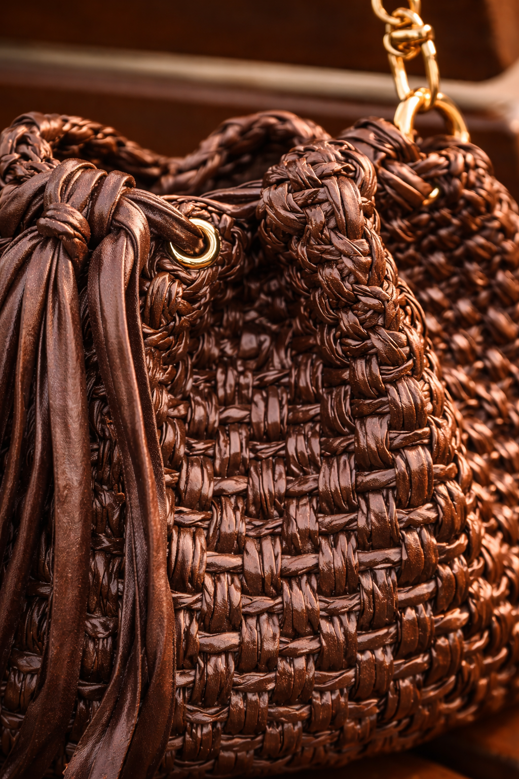 Realizzata interamente a mano, si distingue per la lavorazione intrecciata compatta e luminosa, che dona profondità e carattere al design. La silhouette morbida è valorizzata da dettagli raffinati come la catena dorata singola e i laccetti decorativi, che aggiungono movimento e personalità .