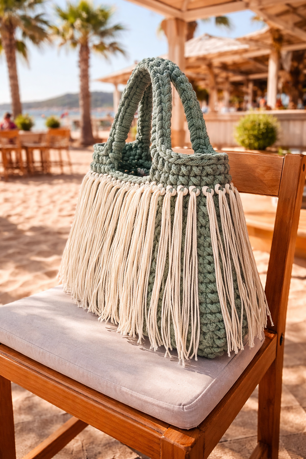 Questa borsa artigianale in crochet unisce naturalezza, stile boho e cura dei dettagli in un accessorio perfetto per la stagione estiva. Realizzata in filato spesso color verde salvia, si distingue per la lavorazione intrecciata che crea una texture materica e sofisticata, capace di esaltare ogni look con un’eleganza rilassata.