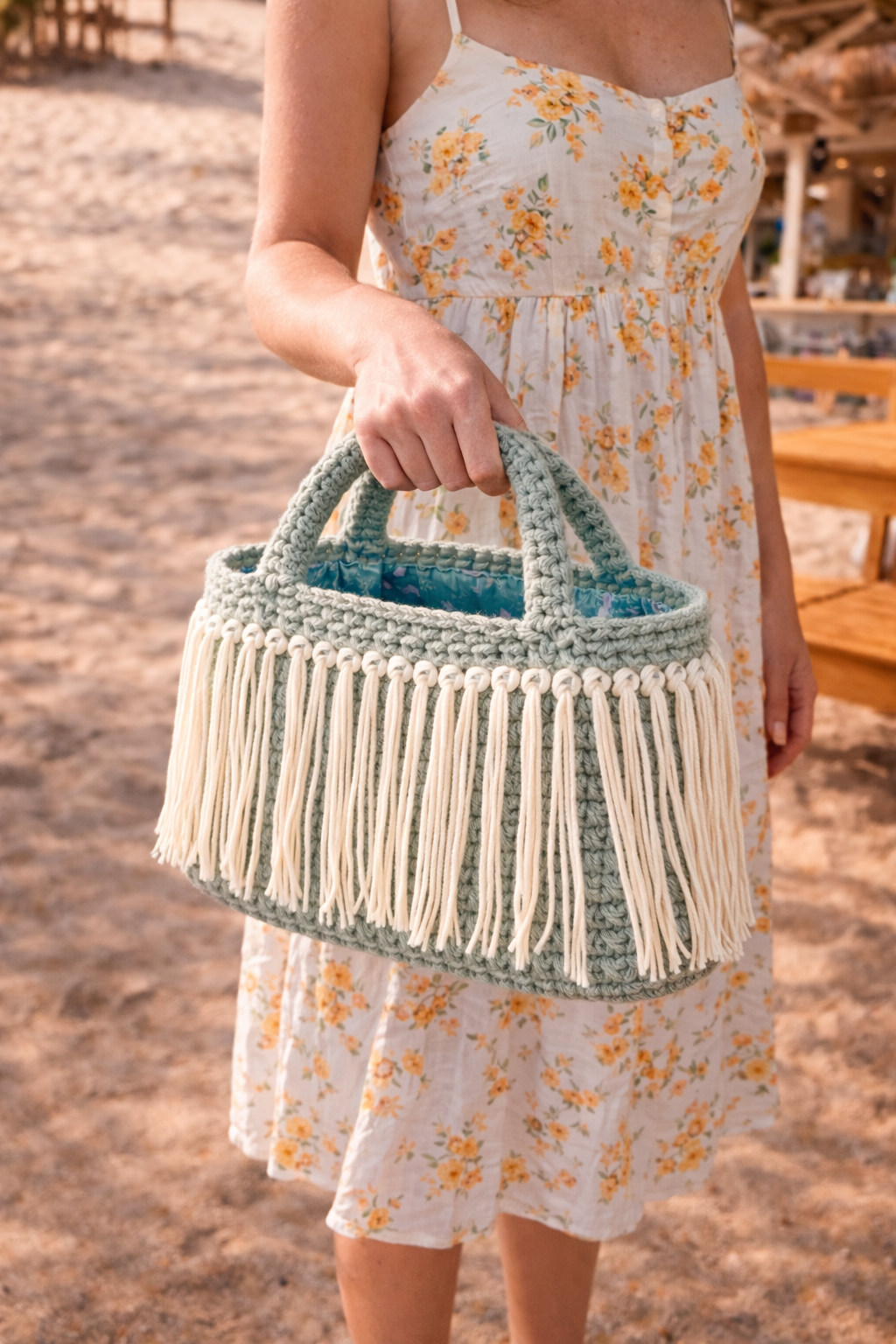 Borsa crochet verde salvia con frange crema e fodera floreale, perfetta per uno stile estivo boho chic.