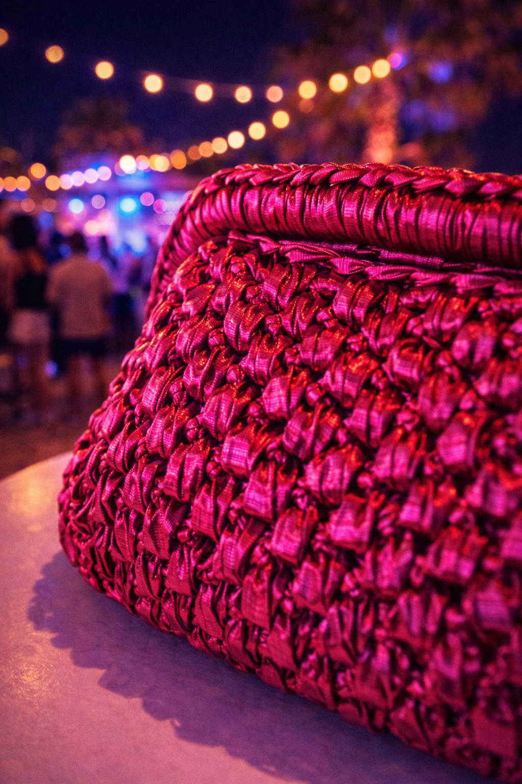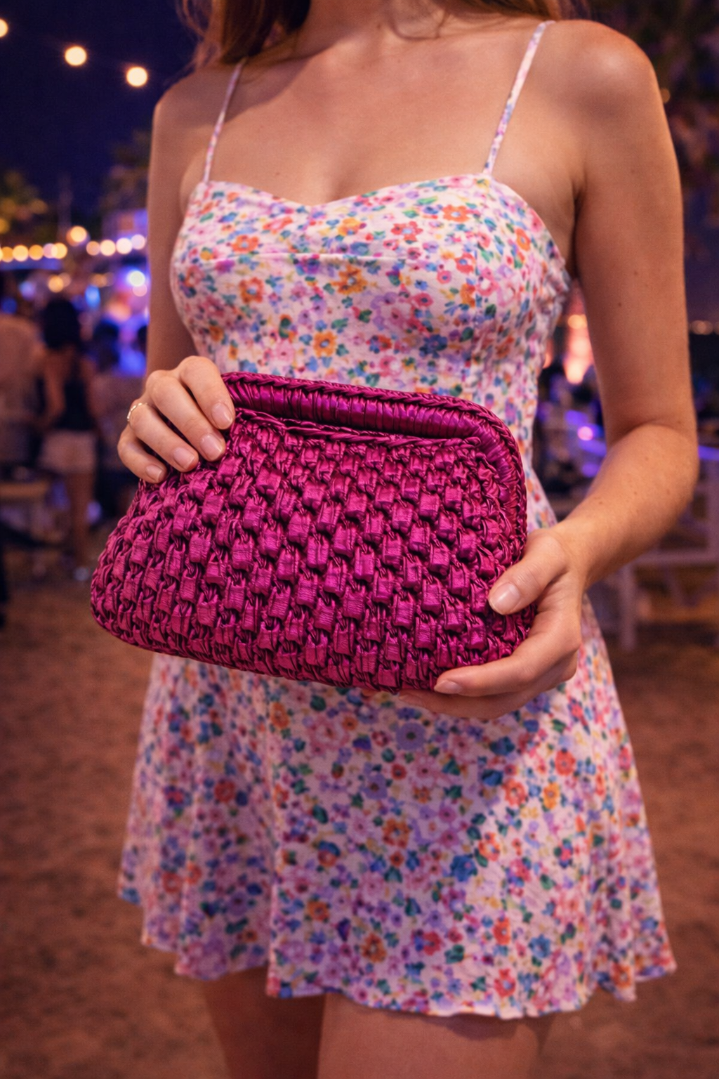 Una clutch fucsia intrecciata dal design sofisticato e luminoso, perfetta per valorizzare i look serali.