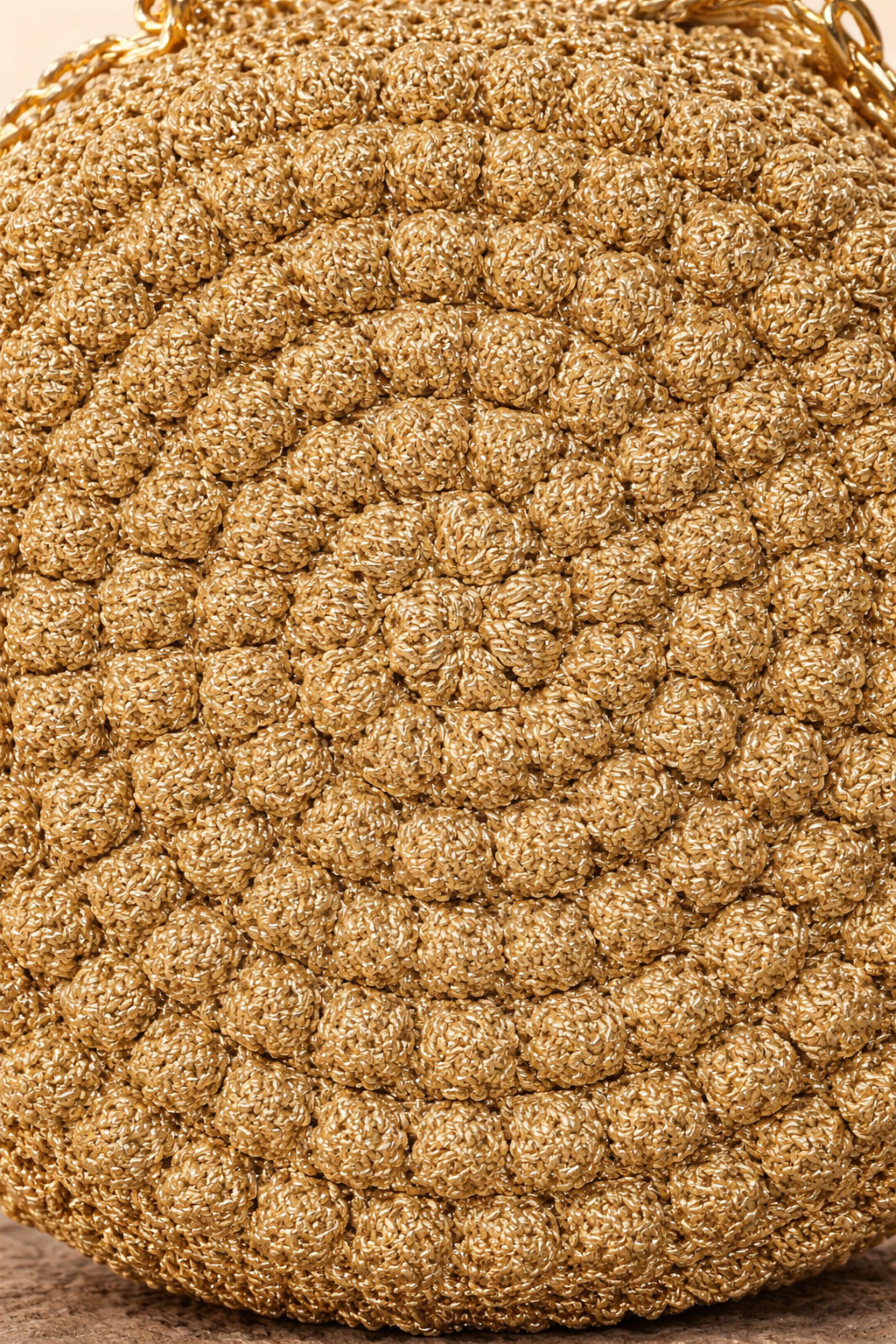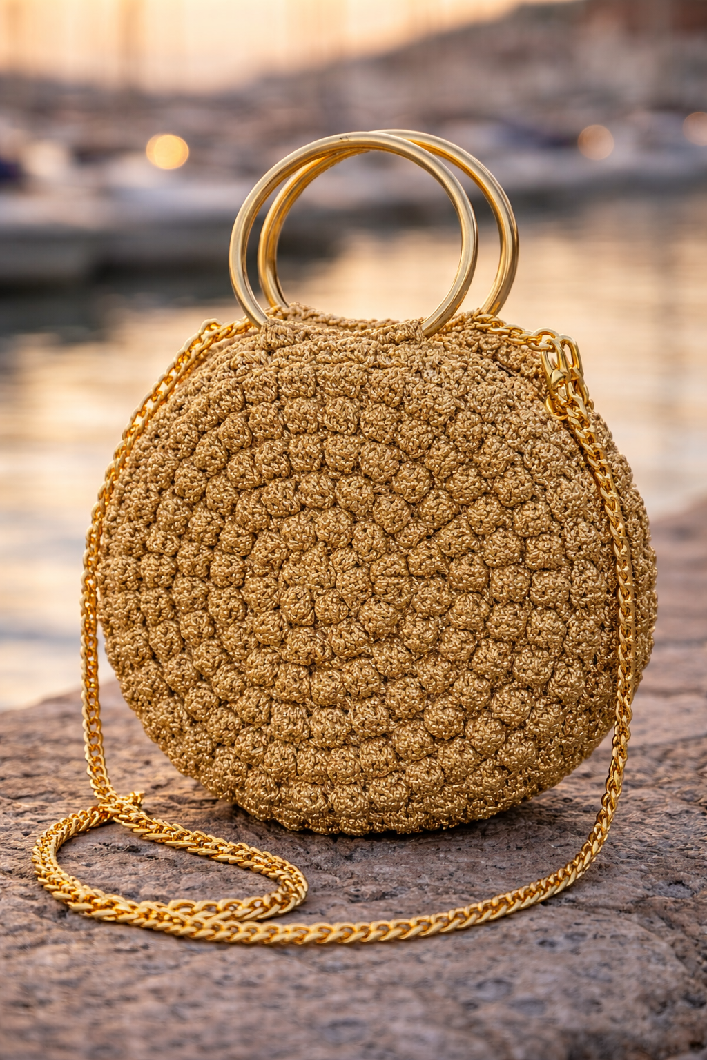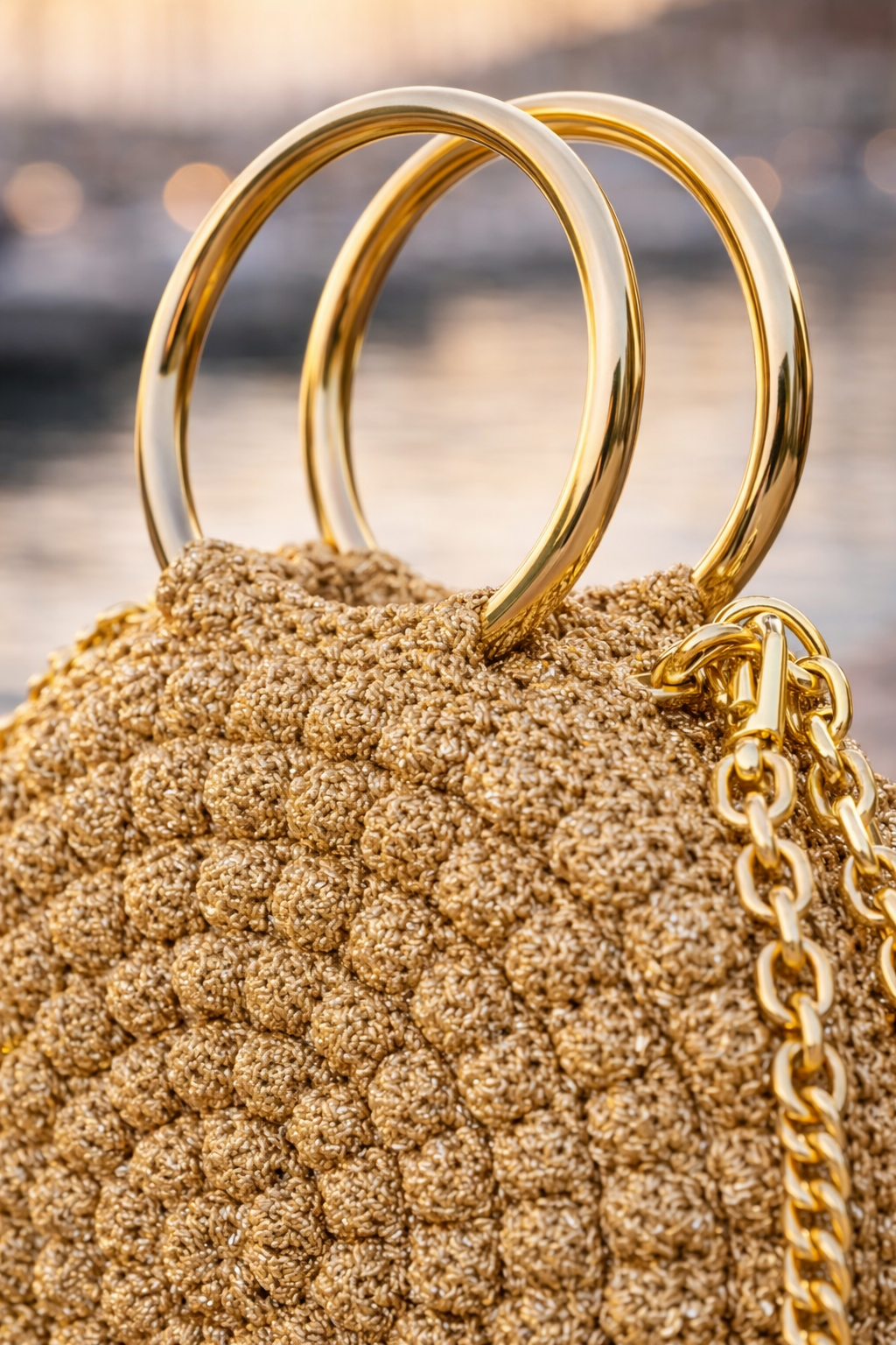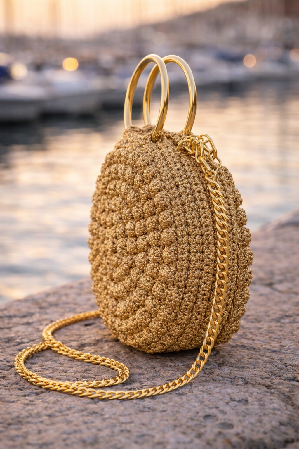 Una borsa all’uncinetto color oro, fatta a mano, che unisce luminosità e artigianalità in un design elegante e femminile.