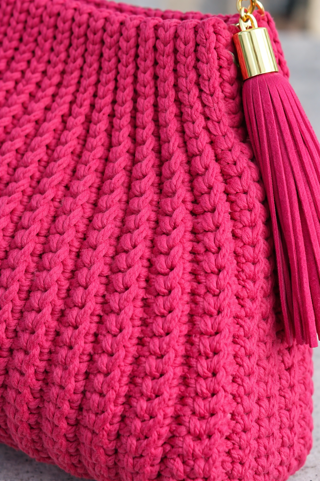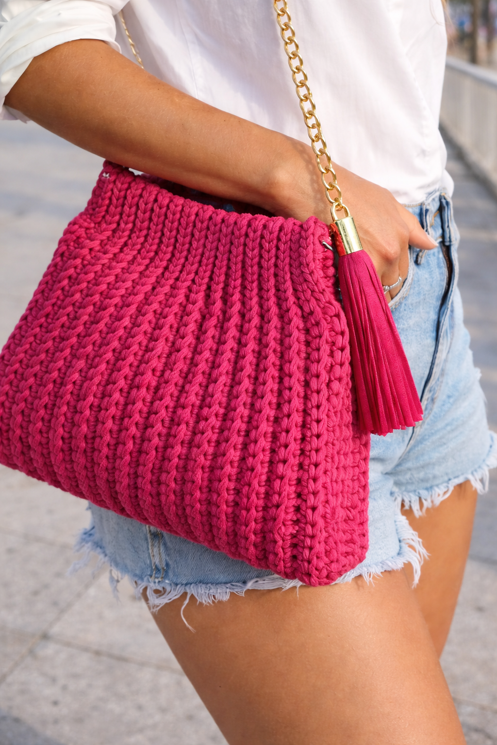 Una borsa all’uncinetto color fucsia intenso, vivace e raffinata, che unisce artigianalità e design essenziale in una texture tridimensionale.