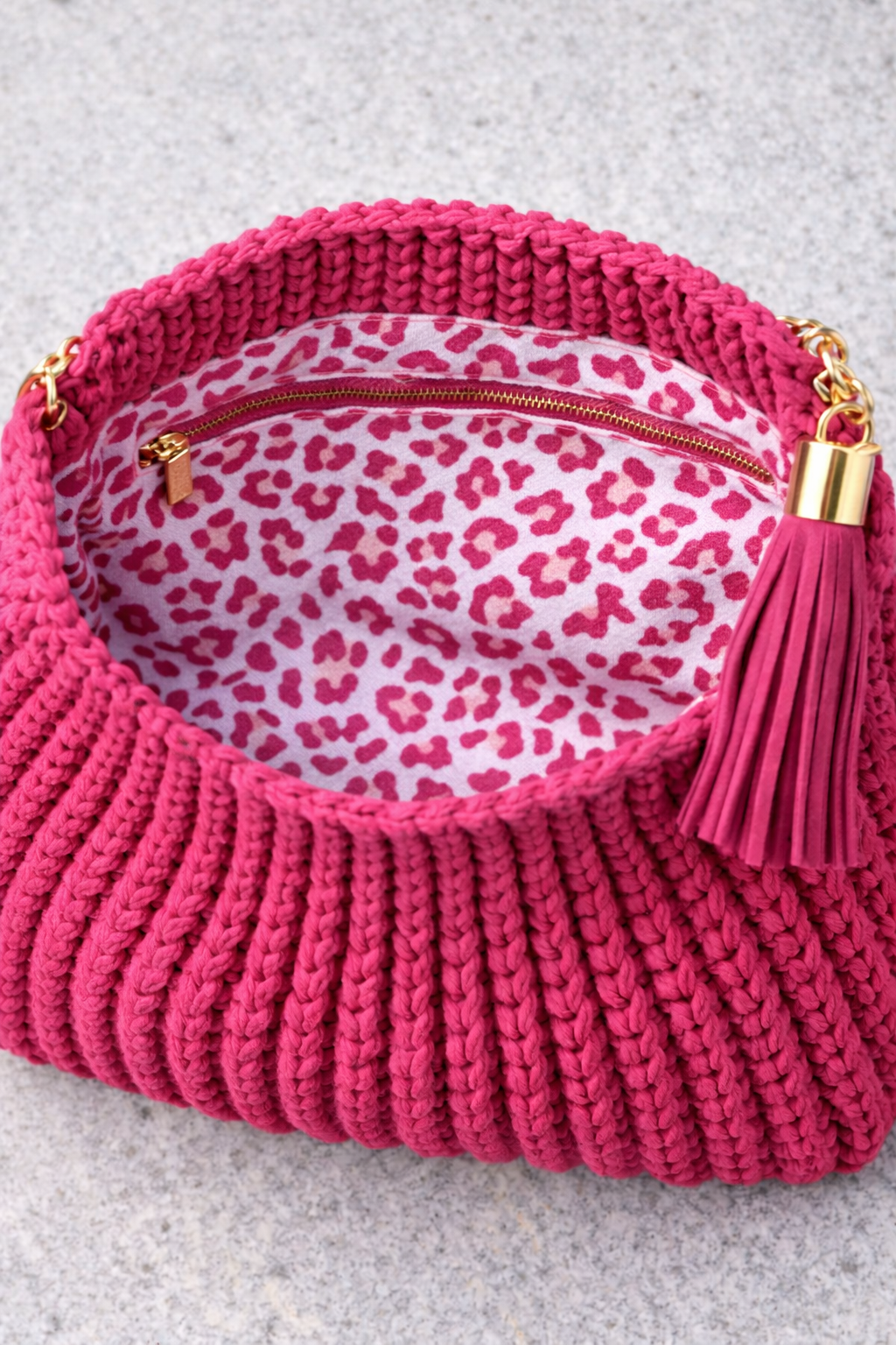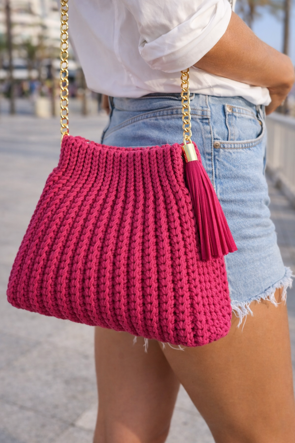Vivace, femminile e raffinata, questa borsa è interamente realizzata a mano all’uncinetto con un filato spesso e compatto color fucsia intenso, capace di valorizzare la lavorazione artigianale attraverso una texture regolare e tridimensionale.