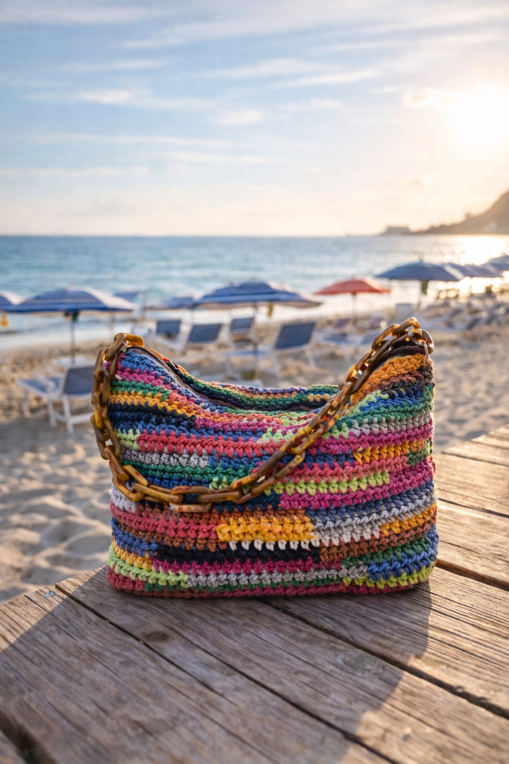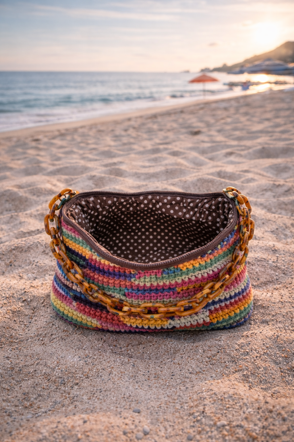 Borsa artigianale in uncinetto multicolore, realizzata a mano e rifinita con manico a catena effetto resina. Compatta e vivace, con interno foderato a pois, è l’accessorio ideale per look estivi casual chic.