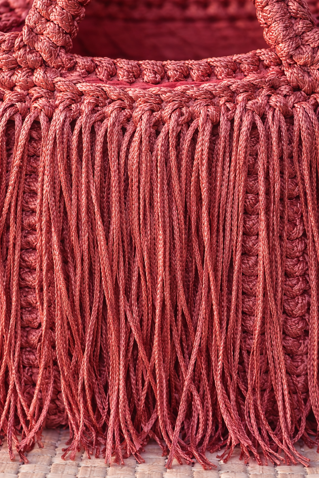 Borsa artigianale in macramé con frange decorative e manico intrecciato, elegante e distintiva.
