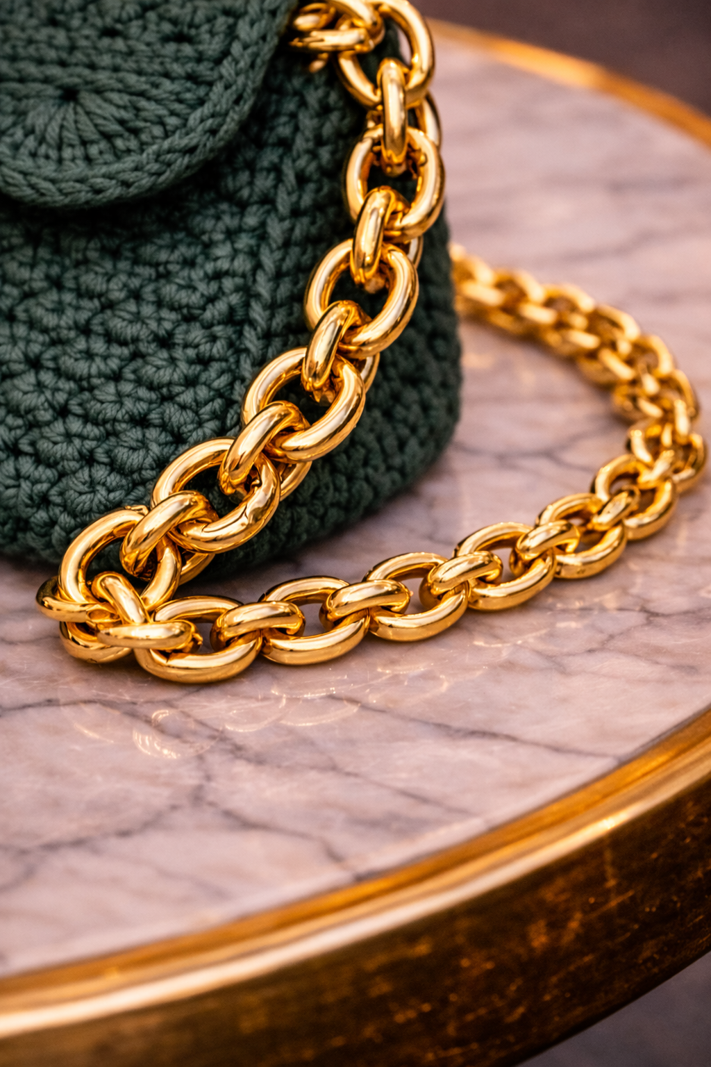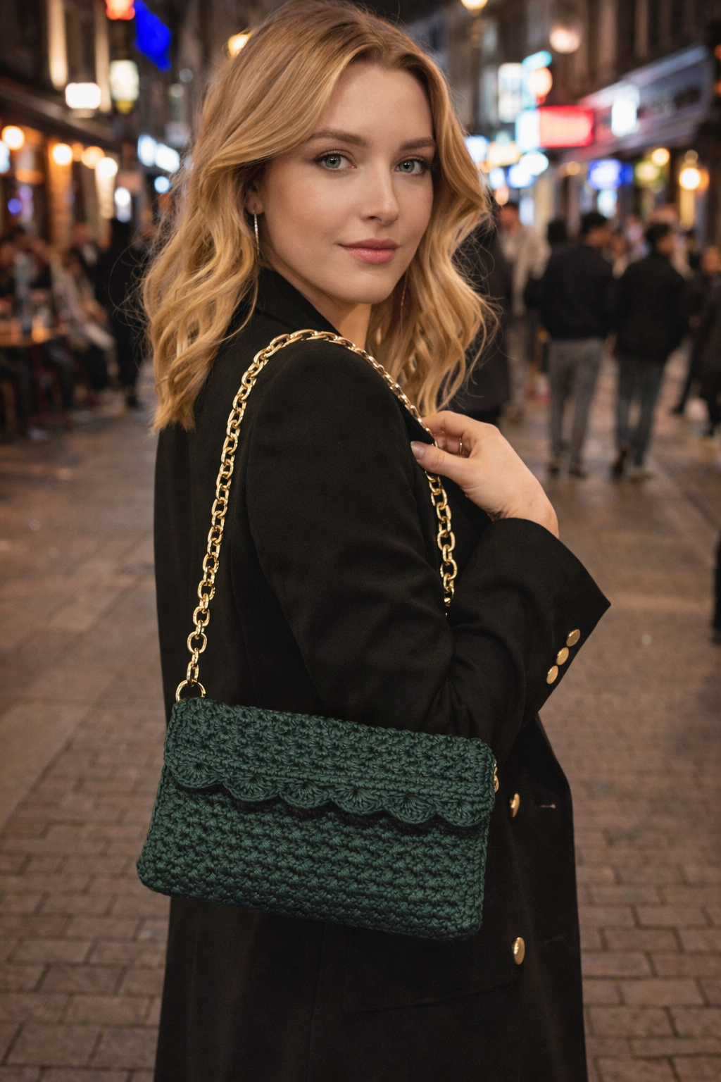 Realizzata all’uncinetto con filato di alta qualità, presenta una texture compatta e regolare, piacevole al tatto e resistente nel tempo. La linea pulita e la forma piatta la rendono leggera e pratica, ideale da portare a mano o con catena (ove prevista), senza ingombri.