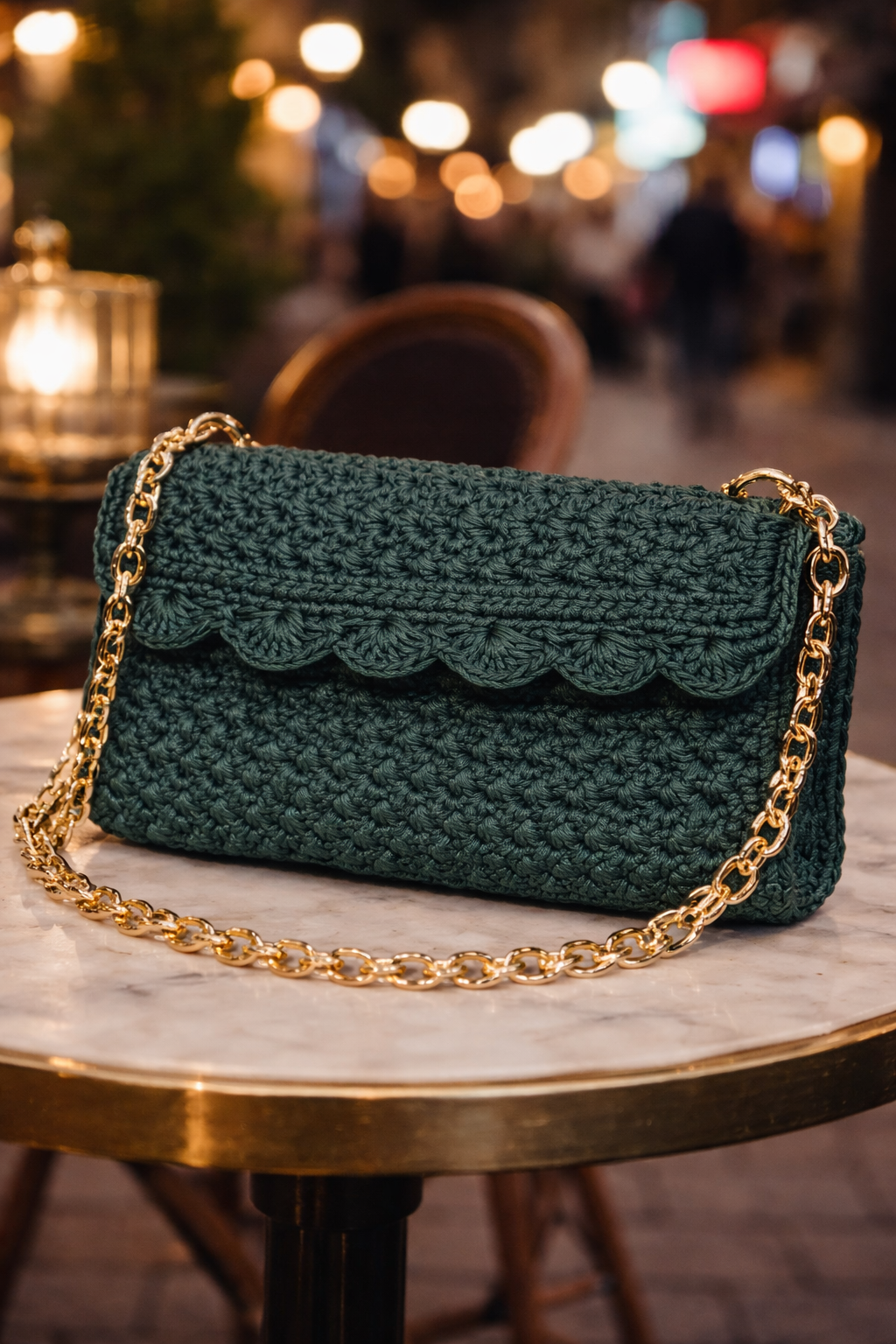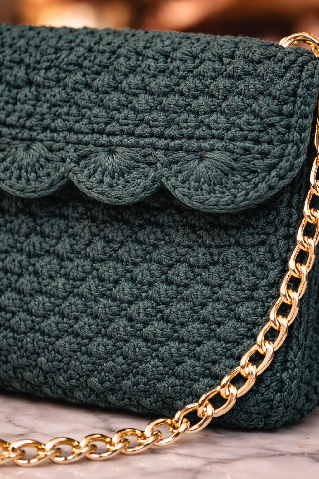 Una bustina piatta in verde bosco, elegante ed essenziale, realizzata interamente a mano all’uncinetto con filato di alta qualità.