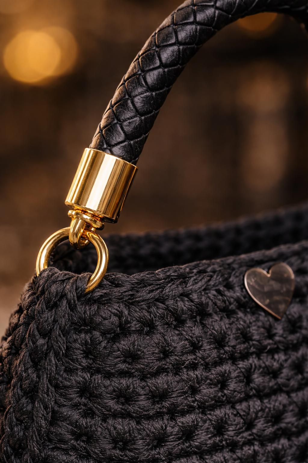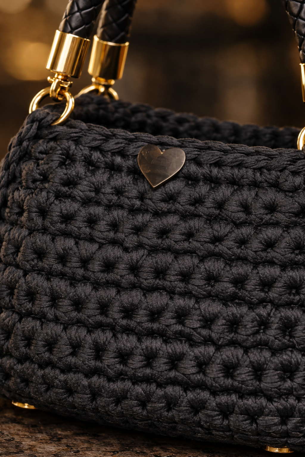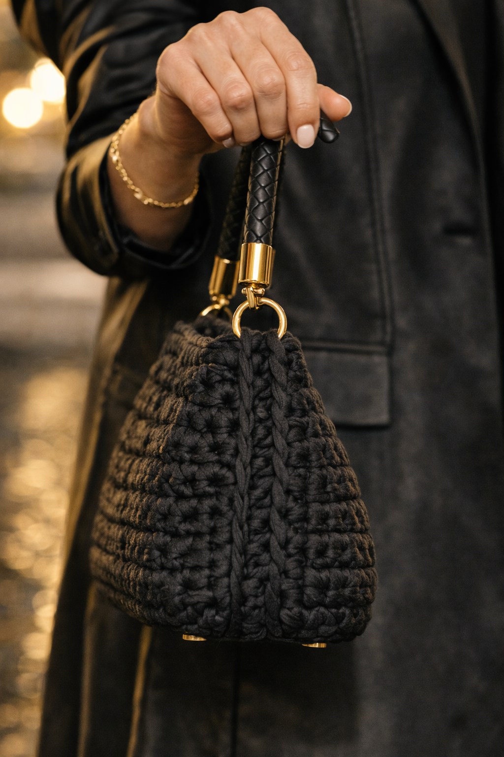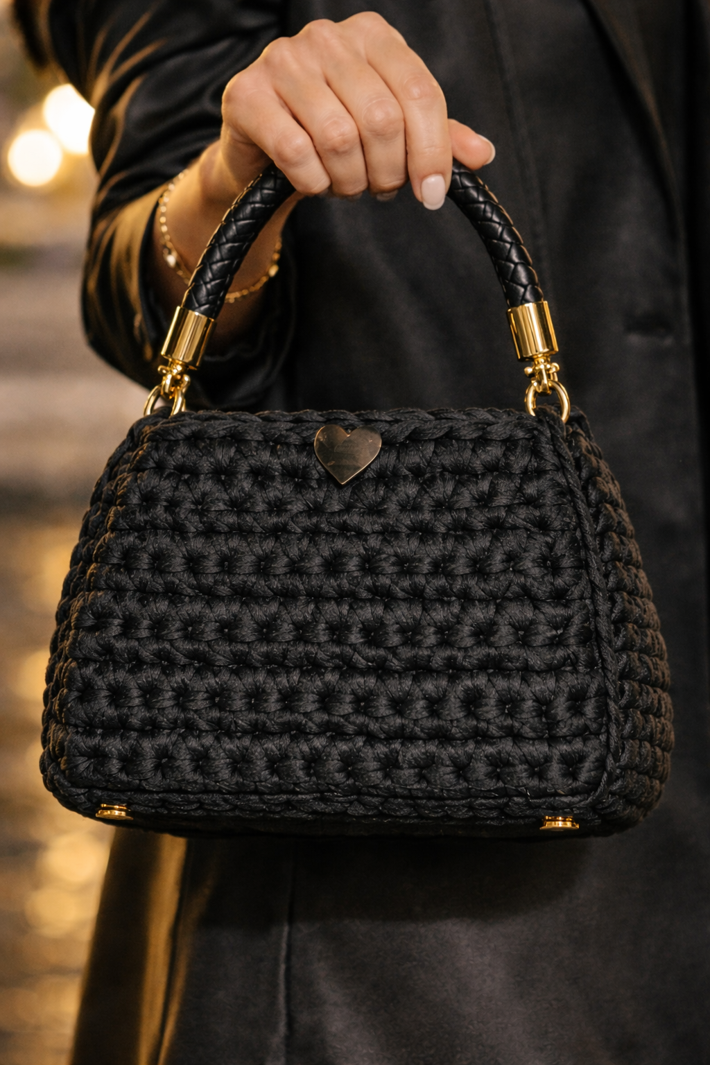 Una borsa nera all’uncinetto, realizzata a mano, che unisce texture tridimensionale e design strutturato per un’eleganza serale decisa.