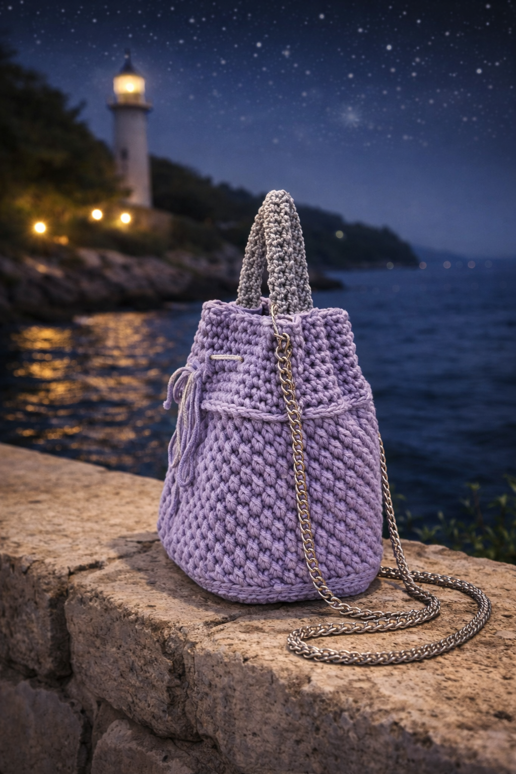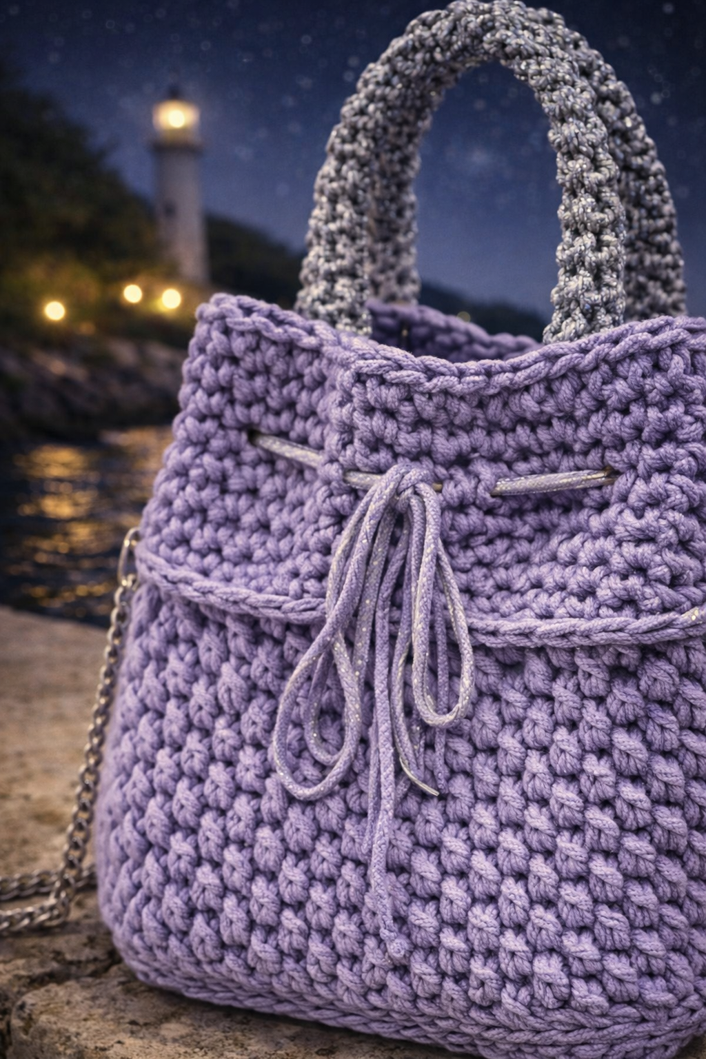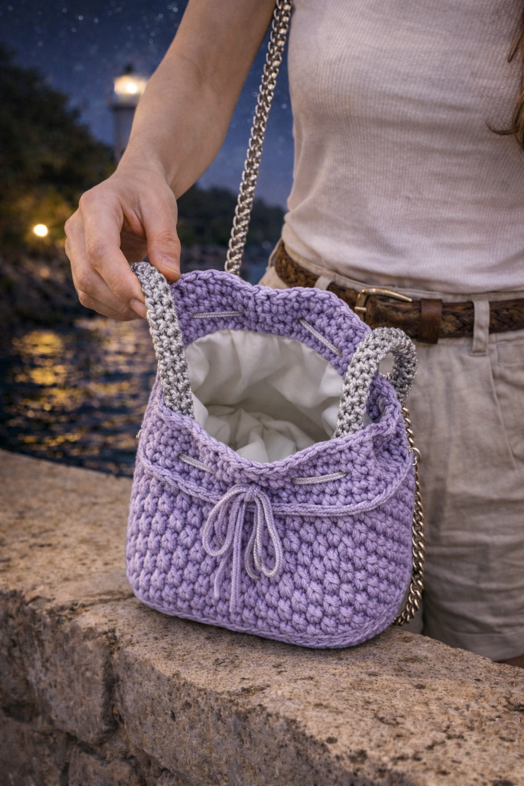 Questa borsa secchiello all’uncinetto in tonalità lilla è pensata per accompagnare momenti speciali e serate estive sul mare. La lavorazione compatta e tridimensionale valorizza la texture del filato, mentre la silhouette morbida mantiene una struttura definita ed elegante.
