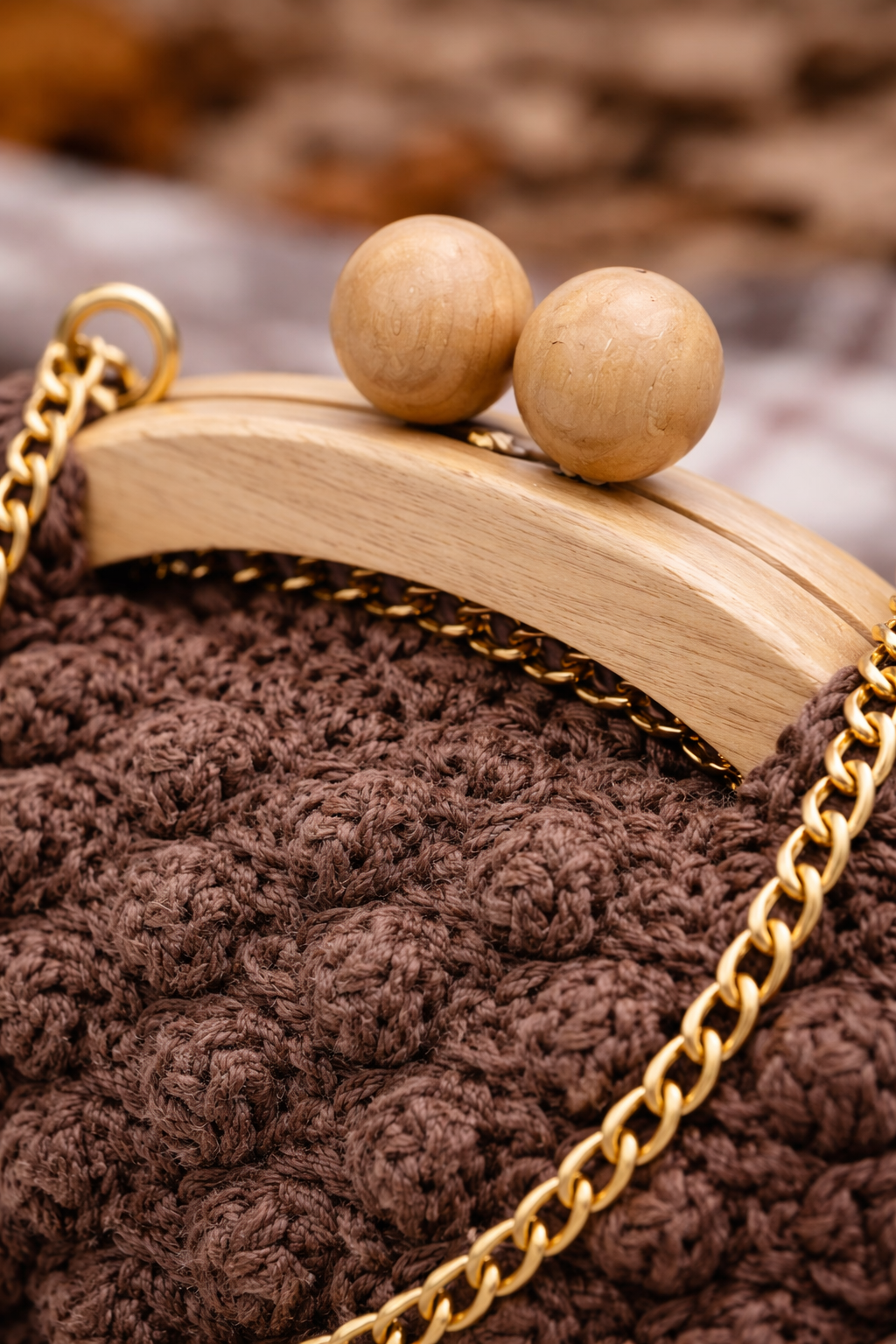 La chiusura click-clack in legno naturale, impreziosita da pomelli sferici, crea un raffinato contrasto con il filato nei toni caldi del marrone. L’interno è completamente foderato con un tessuto animalier leopardato, che aggiunge un dettaglio deciso e contemporaneo, mantenendo al tempo stesso funzionalità e resistenza. La tracolla a catena dorata, removibile, consente di indossare la borsa sia a spalla sia a tracolla, adattandola a look quotidiani ricercati o a outfit serali più eleganti.