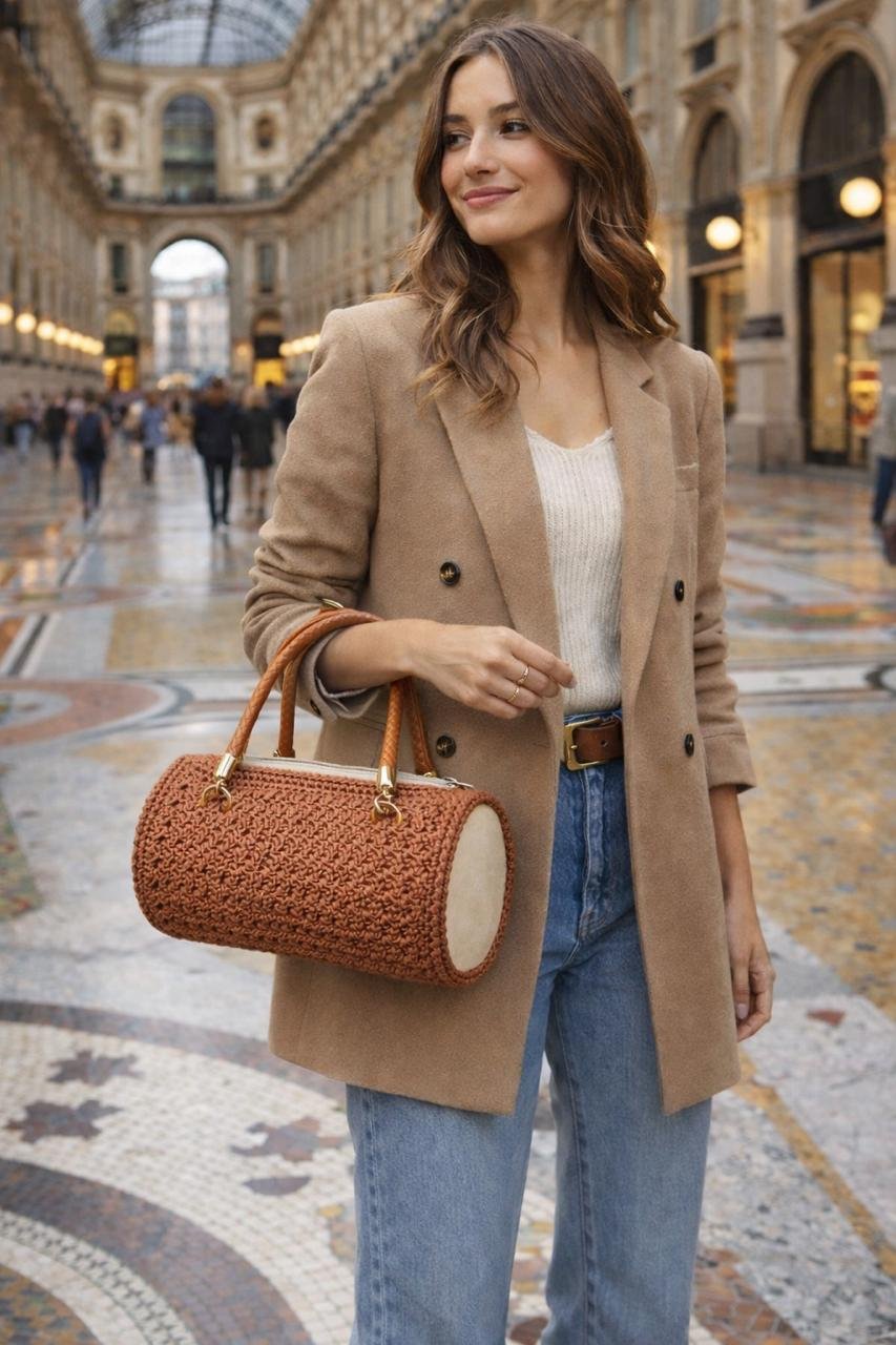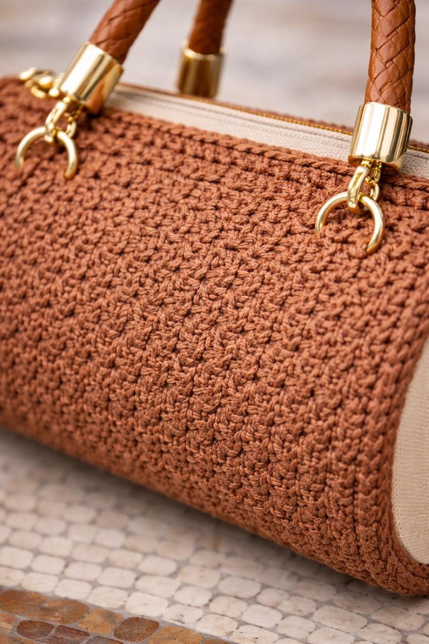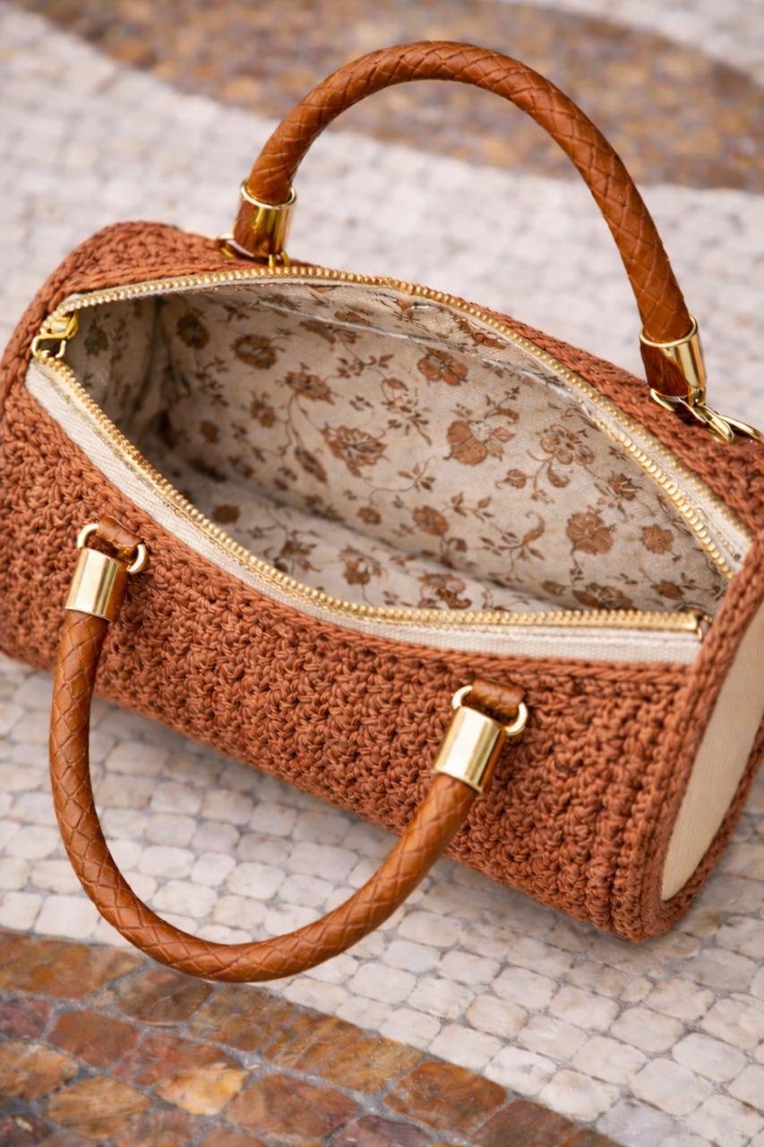 Questa borsa cilindrica è interamente realizzata a mano all’uncinetto, punto dopo punto, per dare forma a un accessorio unico, solido e raffinato.