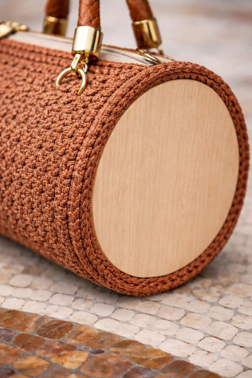 Borsa cilindrica realizzata interamente a mano all’uncinetto, con filato pregiato, lati in legno naturale e dettagli in similpelle e metallo dorato.