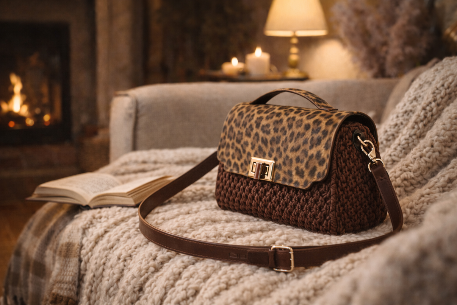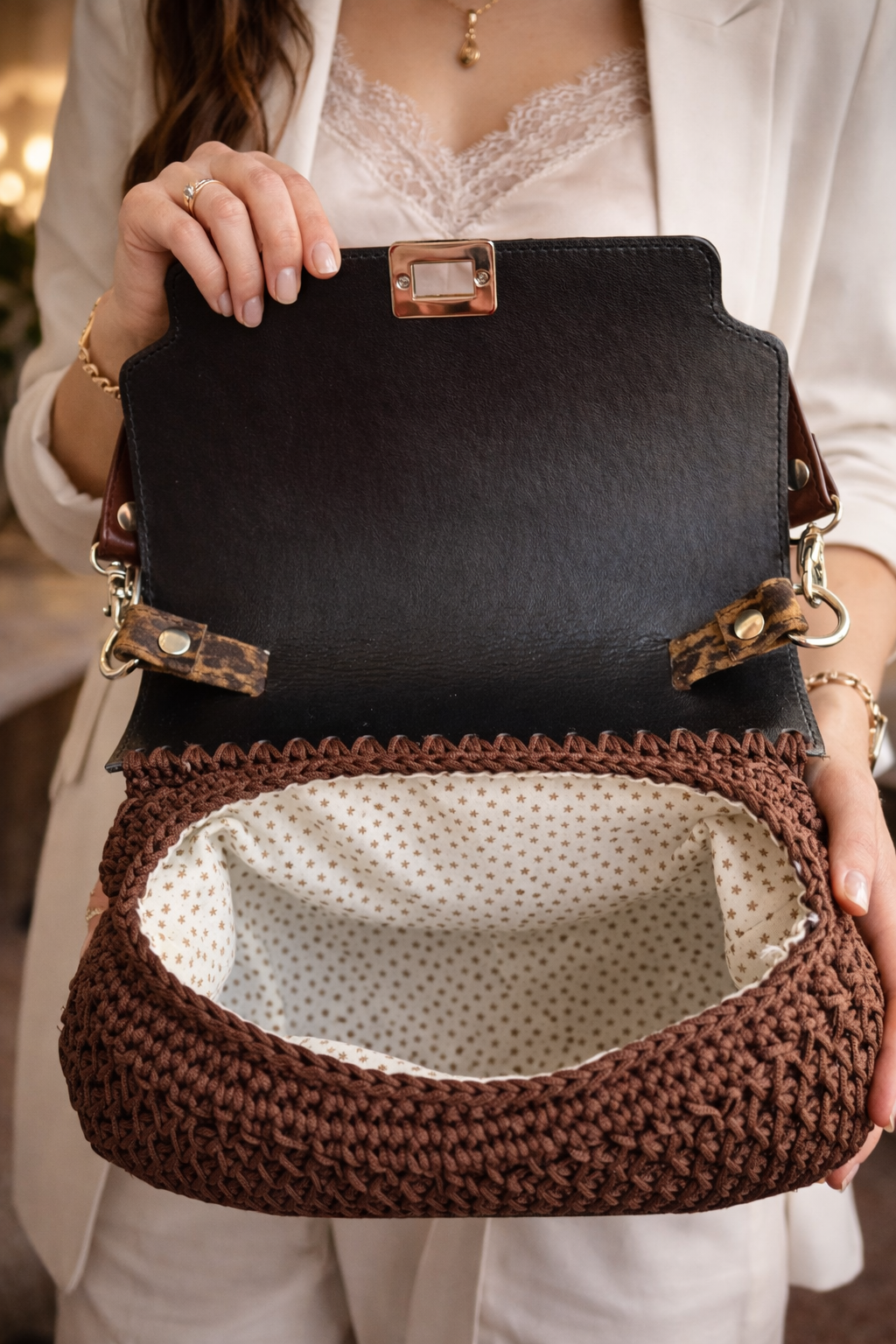 Borsa artigianale in uncinetto con punto nido d’ape, impreziosita da patella in similpelle animalier e chiusura metallica. Compatta, elegante e versatile, con tracolla regolabile e raffinata fodera interna a pois.