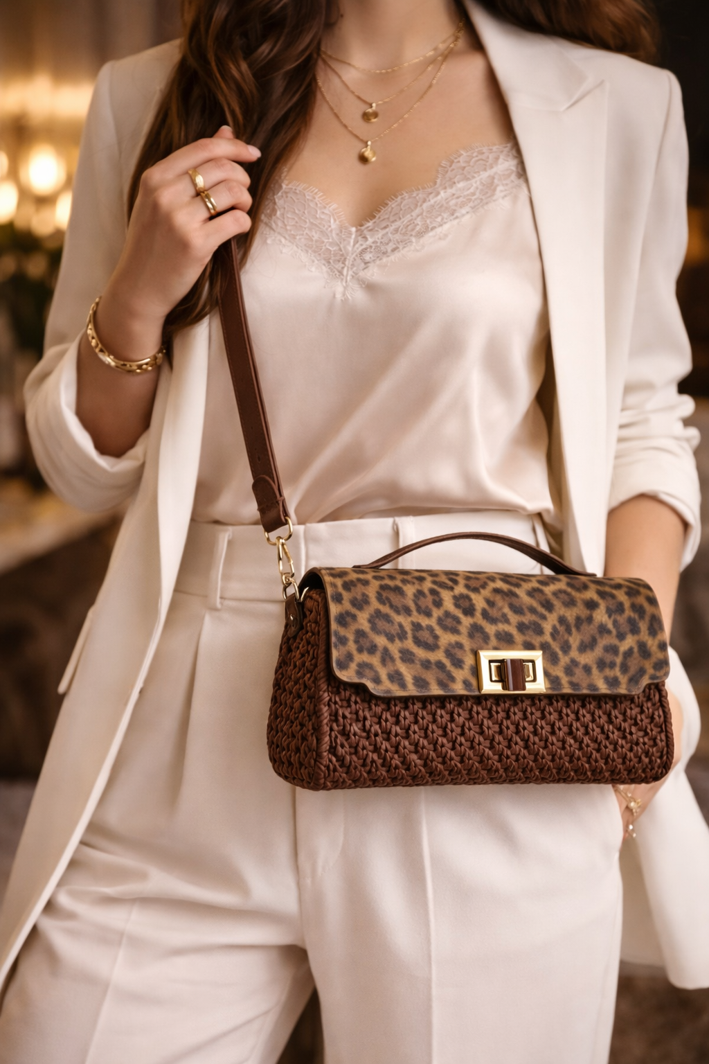La patella in similpelle effetto animalier aggiunge carattere e personalità, creando un contrasto raffinato con il corpo intrecciato color marrone caldo. La chiusura metallica garantisce sicurezza e praticità, mentre il manico superiore e la tracolla regolabile permettono di indossarla sia a mano sia a spalla, adattandosi a diverse occasioni.